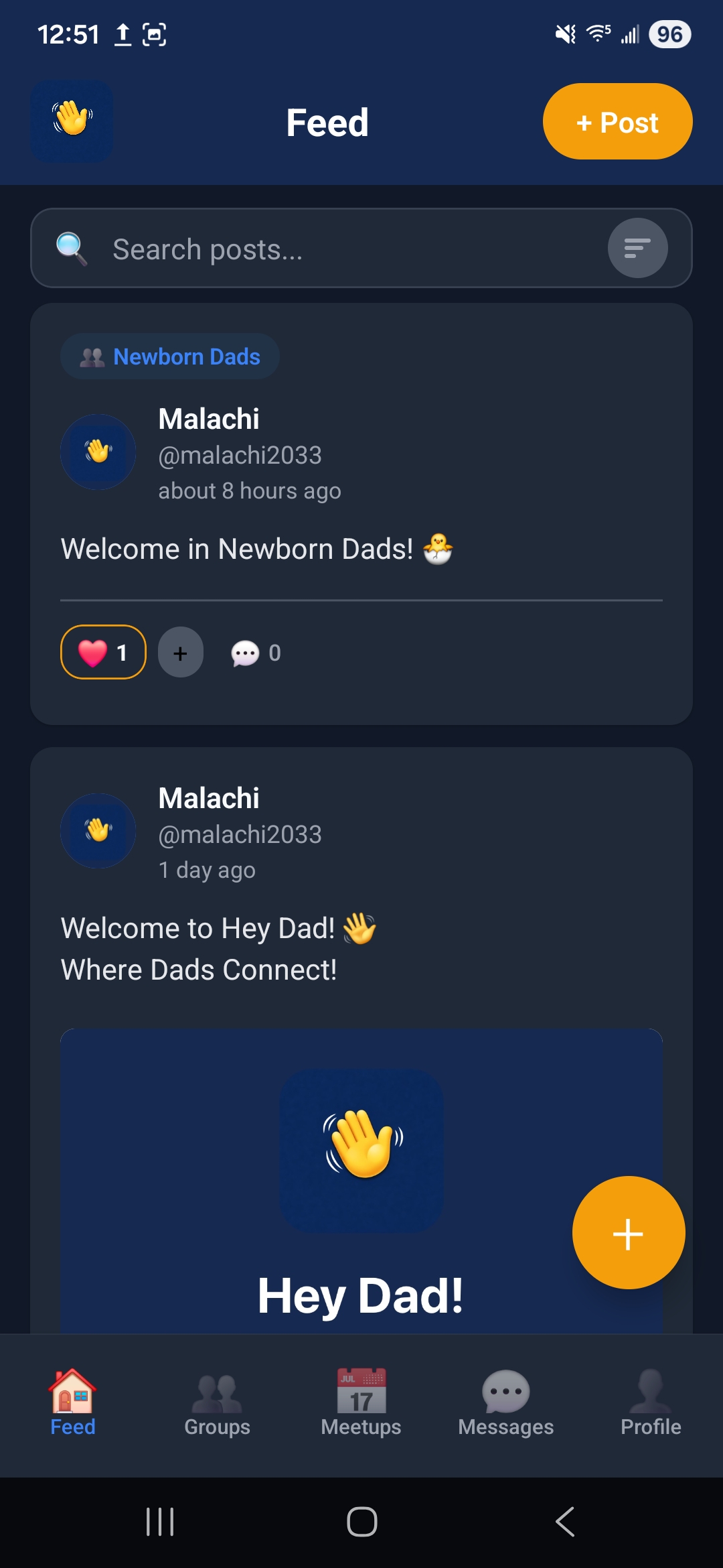 A calm, practical community where dads connect through posts, groups, meetups, and DMs — without the noise.